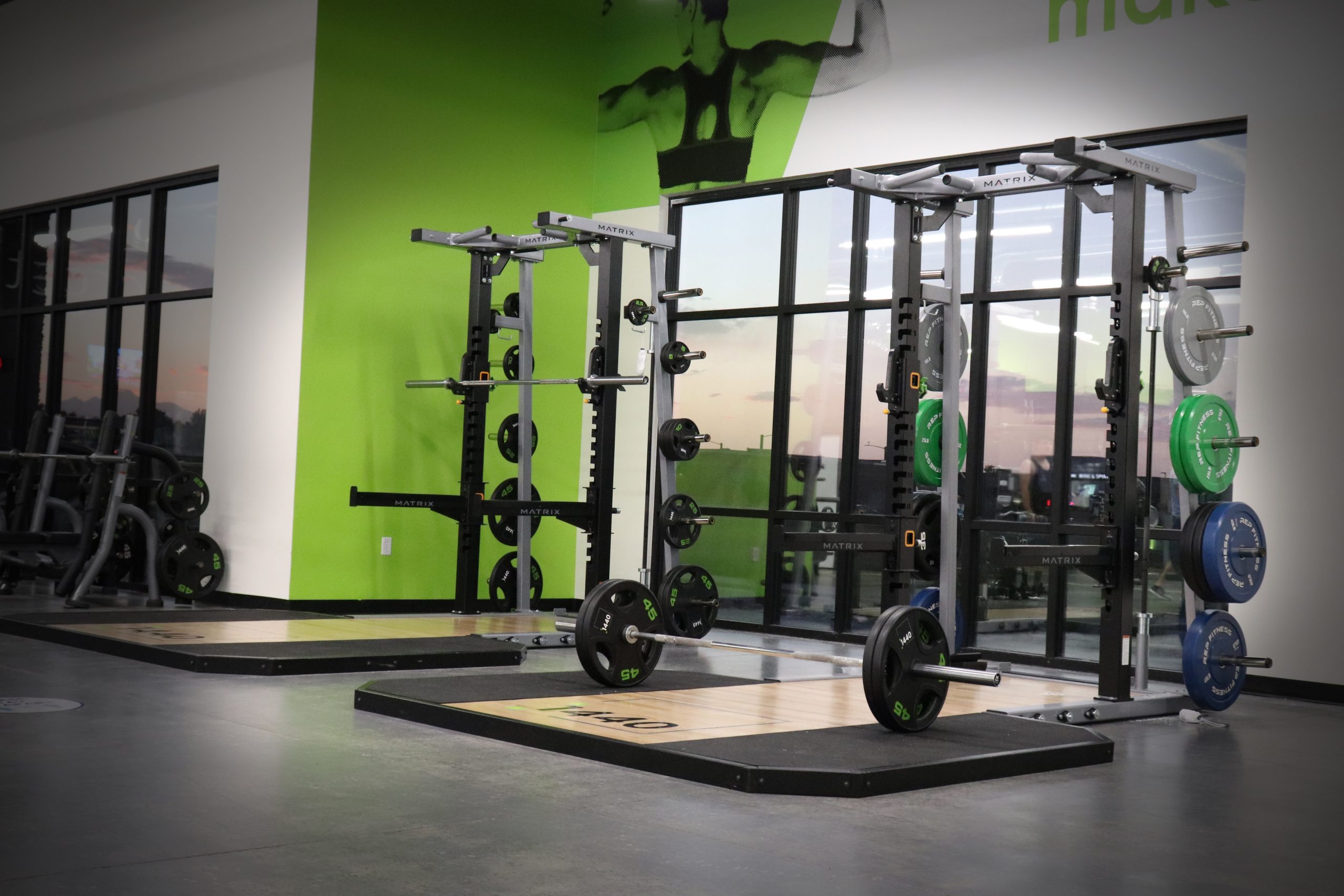 Our Strength Training zone will be an excellent option for those who love to push their strength training abilities! We have this large area decked out in the best Matrix Equipment available! It has everything from Mega Power Racks & Platforms, wide range of Bench presses, & Plate Loaded Training equipment